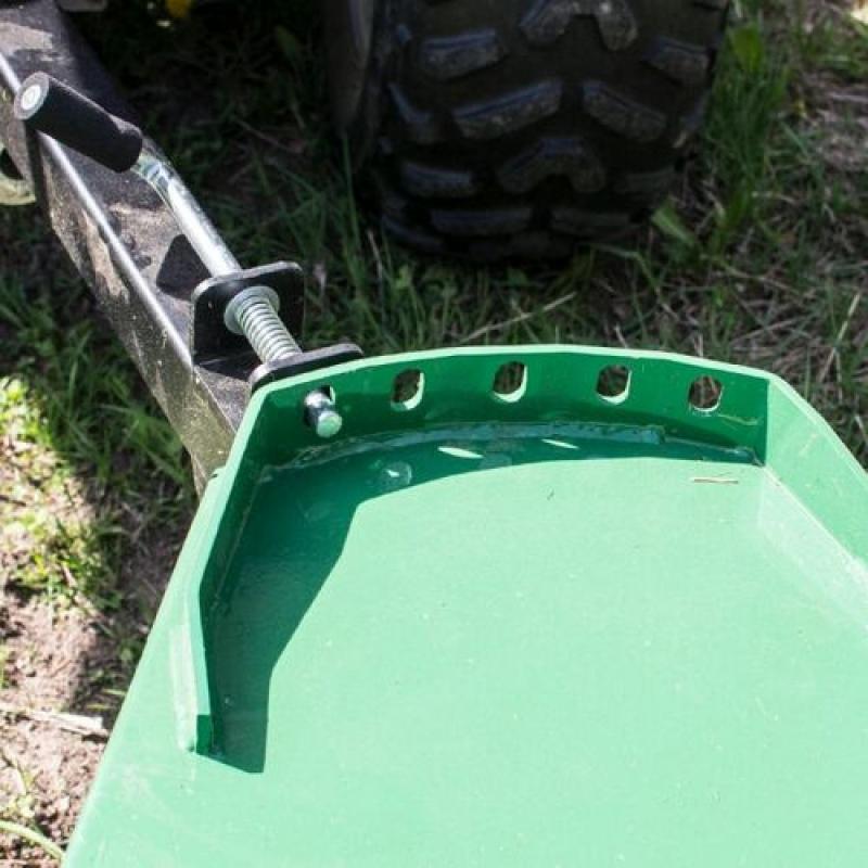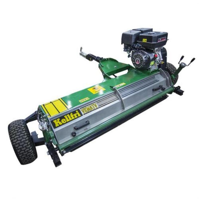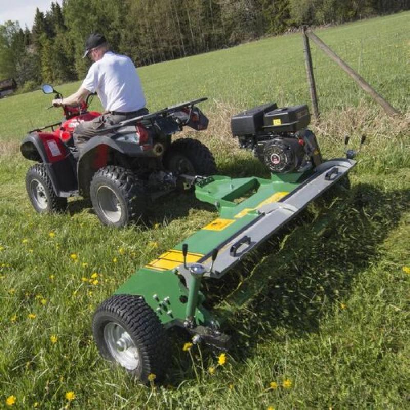 Flail mower with flap for increased speed and versatile handling • Flail mower with hammer flails for ATV • Working width 150 cm • Fit wheels for stability and compliance at the sides or for maximum accessibility at the back • Sturdy rubber balloon wheels (16-6.50x8) • The wheels are individually height adjustable with spring-locked crank to prevent the crank moving backwards as a result of vibration • The angle of penetration is adjusted with a turnbuckle under the tow bar • Skids at the sides for stable, smooth operation • Mudguard at the front to reduce the risk of stone chipping • 13,5 hp Briggs and Stratton engine Why should you choose this pasture topper? • Fitted with a flap at the back, which releases the grass to avoid excessive accumulation under the hood. In this way you save on fuel and reduce wear on the belts. You can also operate at a higher speed than an ATV flail mower without a flap. The grass is also spread more evenly. • Deals with tougher vegetation where there may be ground obstacles such as stones, tussocks and roots • Many of our customers use it for topping pastures, parks and roadsides • Stable construction A flail mower built for a long service life, so that you can spend your money on something else • Grease nipples on support and rotor roller bearings • Sealed cover over the belts • The whole construction is well-protected but easy to access for cleaning, servicing and repair • Wide support roller at the rear • The tow bar has three fixed lateral adjustments Tips for use For best results, and a longer service life for belts, we recommend mowing at a speed of 10 km/h if the grass is of normal height. For higher grass, raise the mower to its maximum and mow twice.