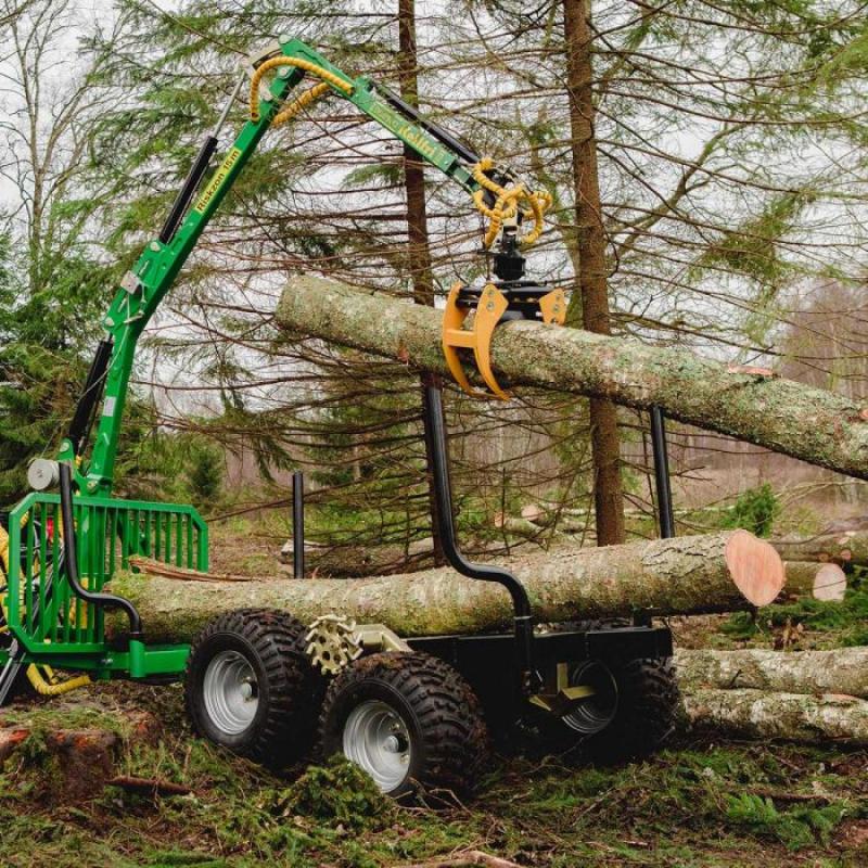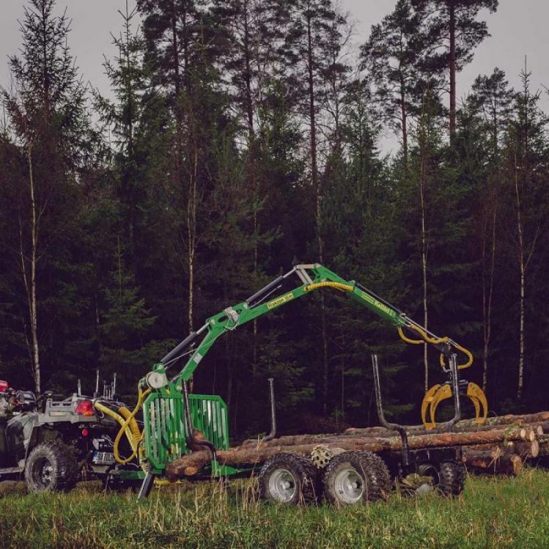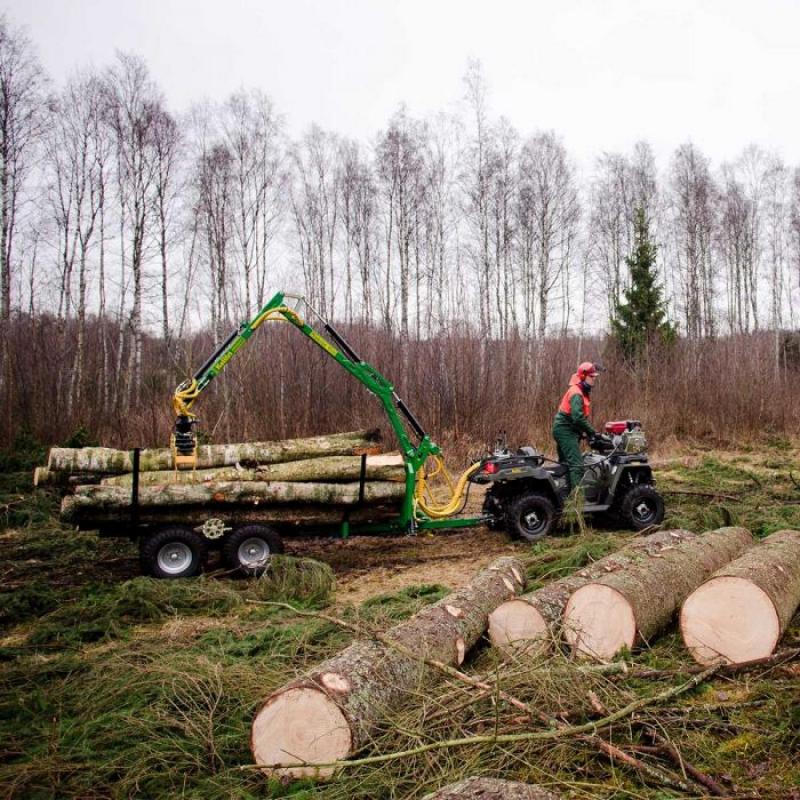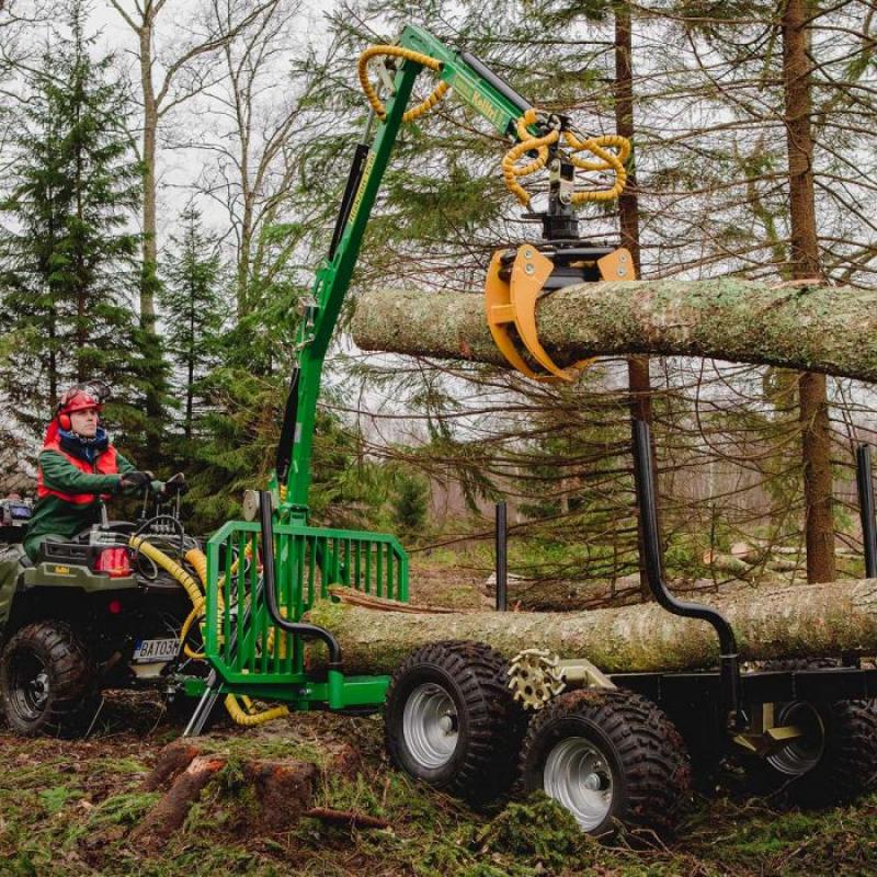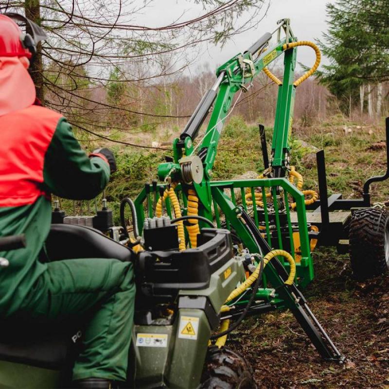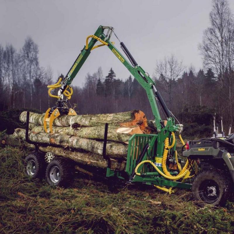 Forestry trailer for ATVs with wheel drive and articulated steering for better handling Articulated steering for better handling • The forestry trailer runs in the tractor's wheel tracks • Better responsiveness in tight passages • Versatile rig • Hydraulic crane with extension boom and own hydraulic system • 9 hp petrol motor • High ground clearance • Stable frame makes it easy to pull the trailer • Terrain-friendly bogie