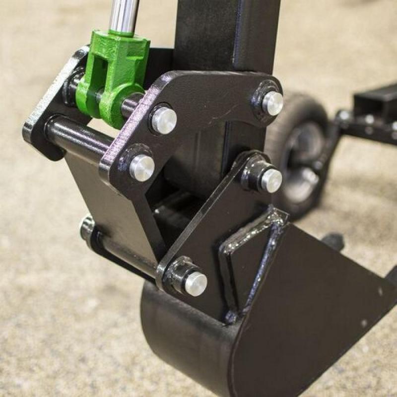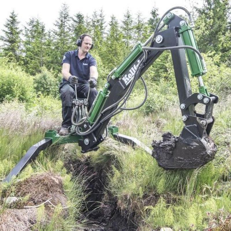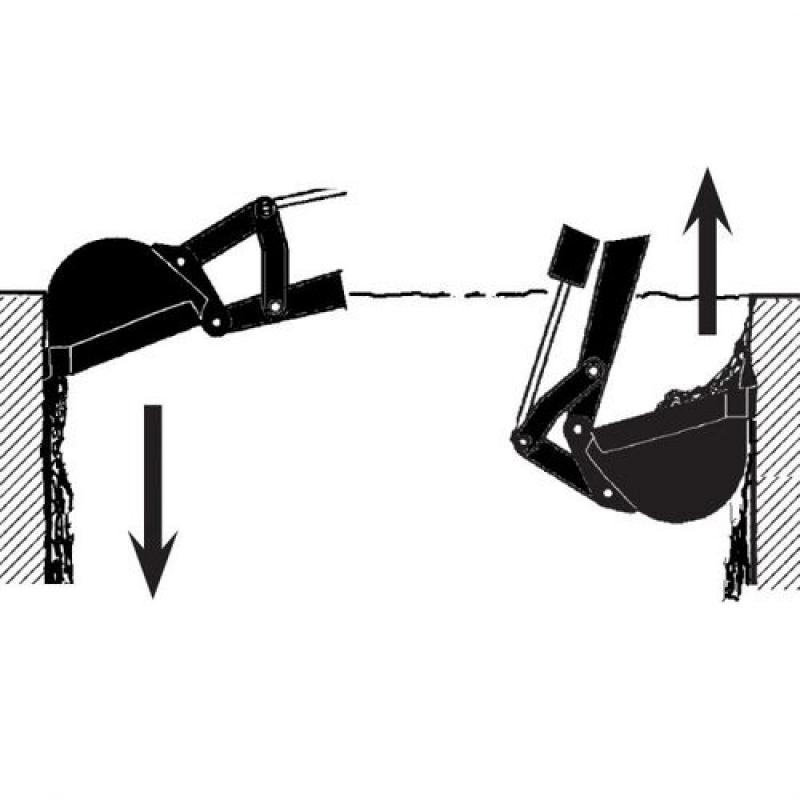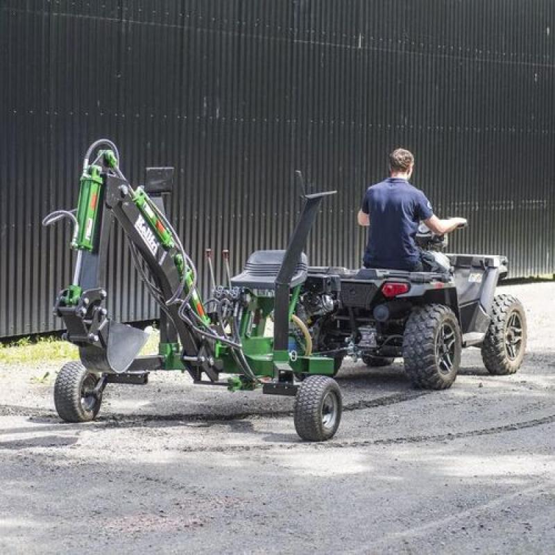 Compact and well-constructed backhoe digger with its own power source. • Backhoe digger with 10 hp petrol motor • Digs 204 cm deep, bucket width 23 cm • Moved with ATV or another vehicle with a 50 mm ball coupling Very versatile backhoe digger for all types of groundwork in confined spaces. This little unit has the capacity for handle much more than you'd think it would. Compact and well-constructed backhoe digger with its own power source in the form of a 10 hp petrol motor with recoil starter. Operator seat 90 cm high with good work overview When the machine has to be moved, the wheels are fitted to the back making it easy to transport; when excavating, the wheels are fitted at the front with the stabilisers at the back and the machine is then moved by dragging it backwards or forwards using the first boom and outer boom. Solid quality material thickness in construction and buckets, e.g. 8 mm steel in bucket.