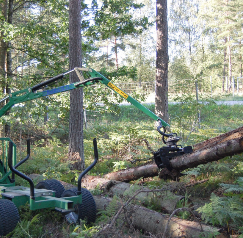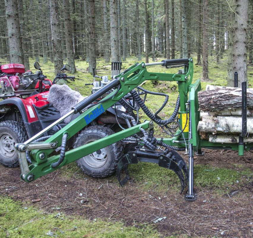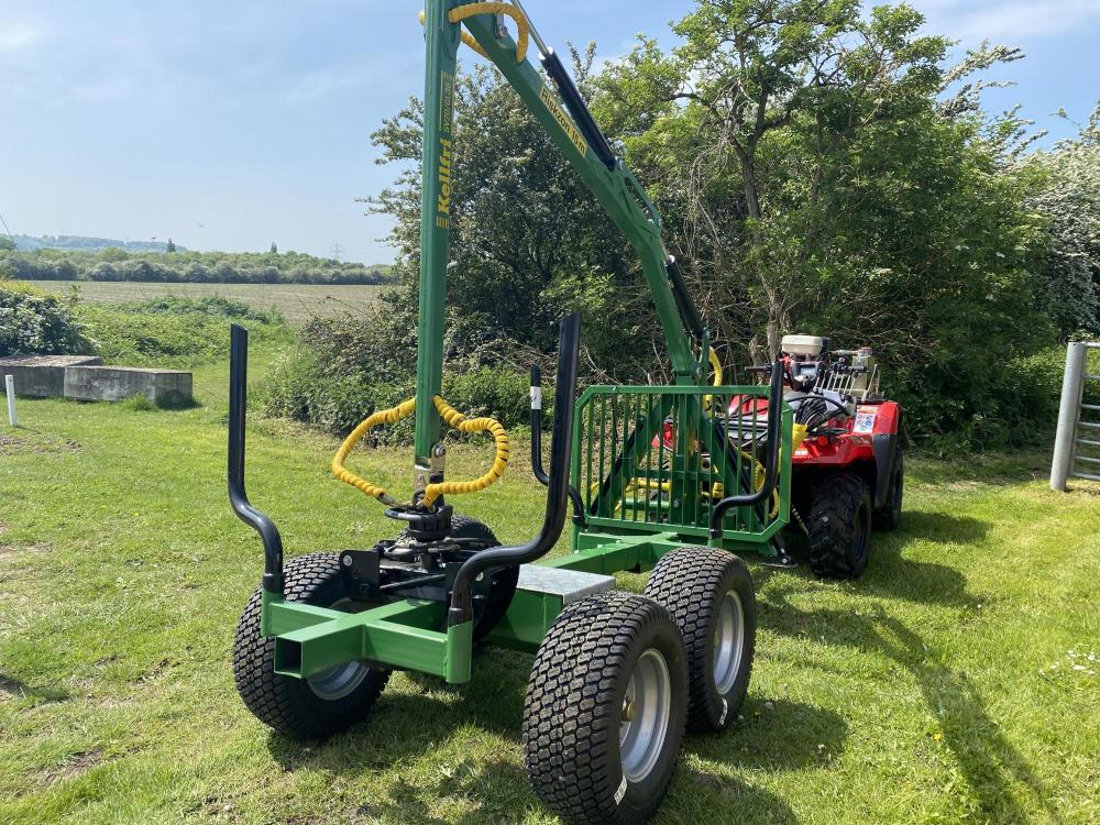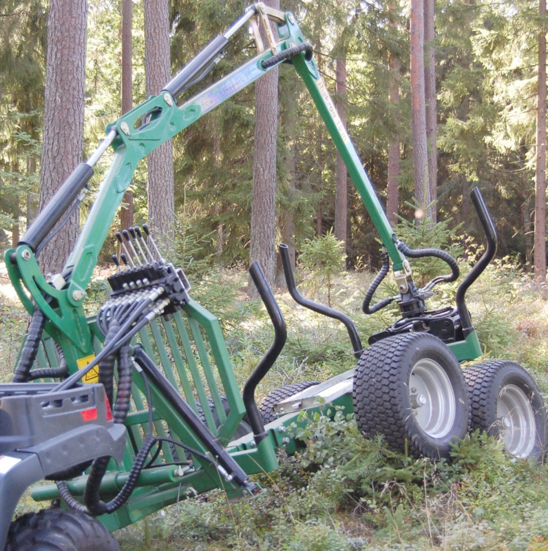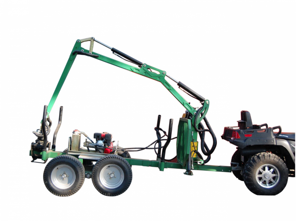 Powerful forestry trailer with 9 hp petrol motor for ATVs or smaller tractors.