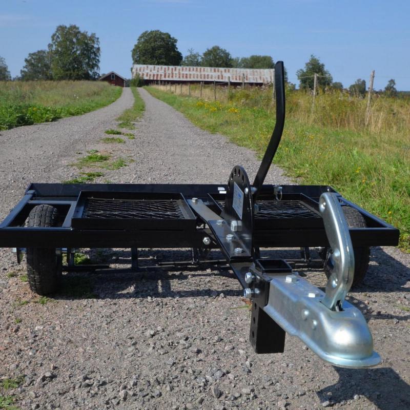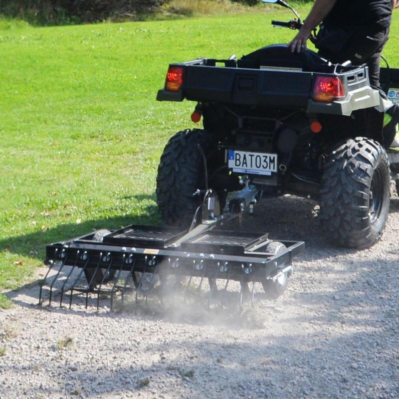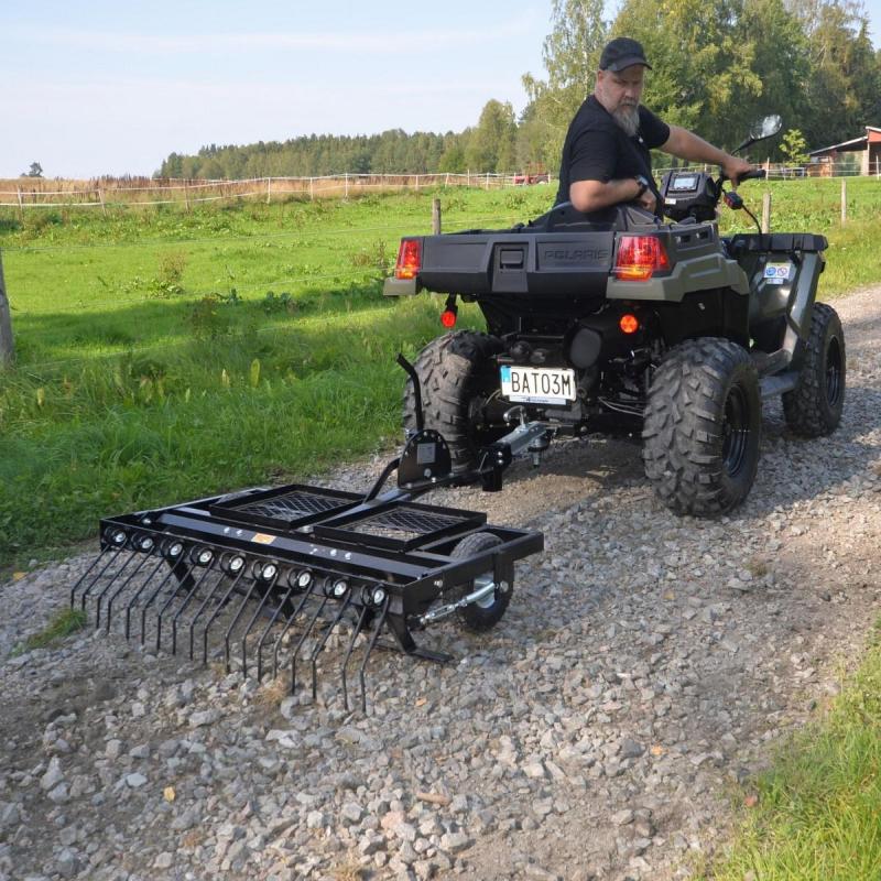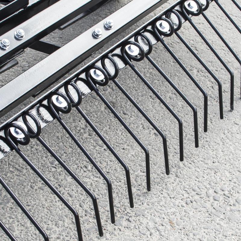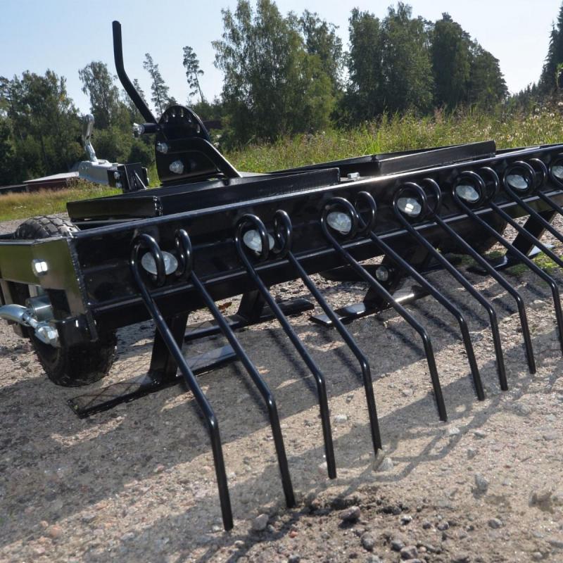 • 5 cutting blades • Working width 105 cm • 9 double raking tines • 50 mm ball coupling. Deep-cultivating yard harrow with for garden tractors or ATVs. Deep-cultivating powder-coated yard harrow if you want to do more than just work on the surface. The harrow has 5 cutting blades which work before the raking tines. For tougher cultivation, you can easily put weights on the frames on top of the harrow to make the blades and raking tines cultivate more deeply. Supplied with a 50 mm ball coupling.