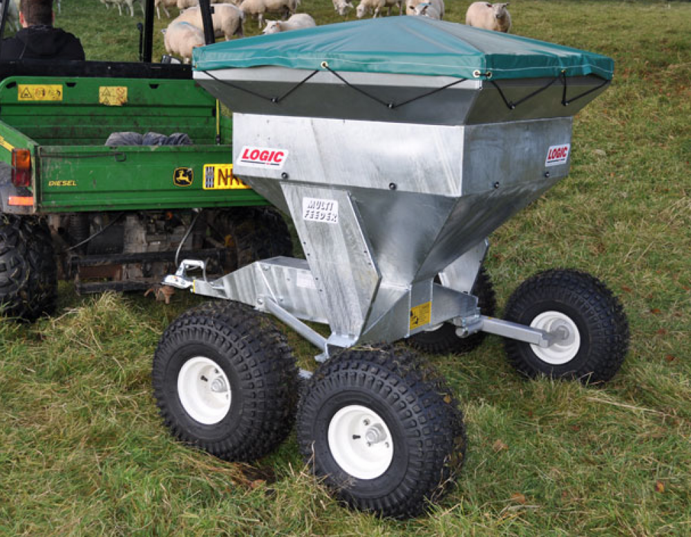 Logics standard UTV/ATV Multi Feeder LMF hopper has a capacity of 356 litres (approximately 320kg, depending on feed type). Suitable for use with other vehicles such as pickups, 4X4s etc., the standard unit comes with 22×11-8 wheels and tyres although different wheel/tyre combinations are available depending upon individual requirements.