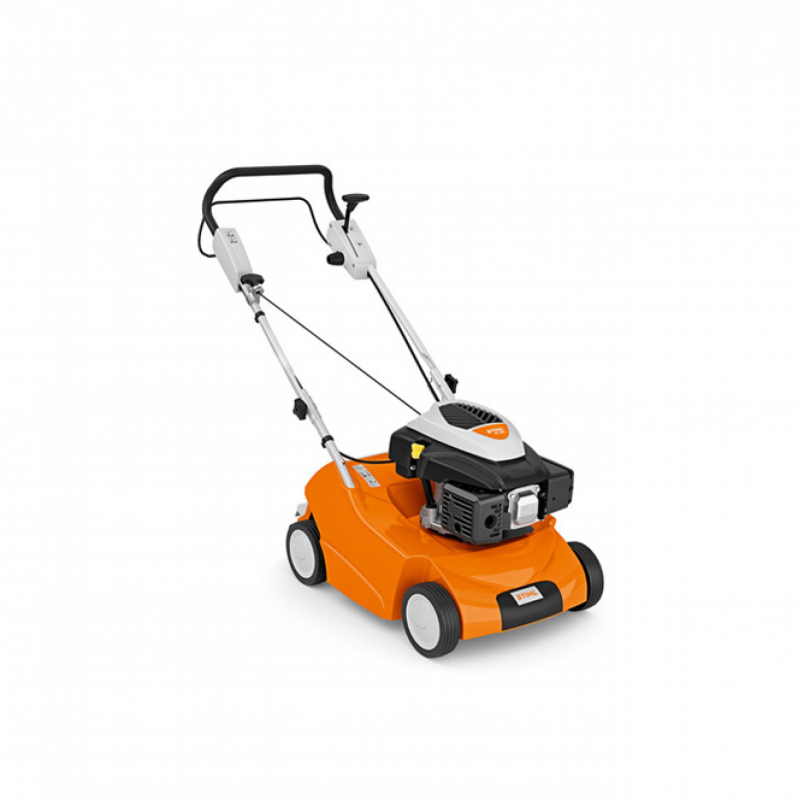 The high-performance STIHL petrol lawn scarifier RL 540 removes moss and lawn thatch from even larger lawns quickly, conveniently and cordlessly. Driven by a powerful petrol engine, the scarifier ensures optimal lawn aeration. The scarifying unit can be conveniently set to the required working depth on the handlebar. This effective complement to your lawn care takes just a few steps per year. Proper scarifying fundamentally improves the supply of nutrients to your lawn and promotes its growth in the long term. Thanks to the working width of 38 cm and the easy-running wheels with special tread, you have all the manoeuvrability and agility you need for your twice-yearly lawn aeration with the STIHL RL 540. The sturdy polymer housing is tough enough to withstand even long-term use. For easy transport, the scarifier is also equipped with a carrying handle. The handlebar can be folded in just a few steps, so that the lawn scarifier can also be stored compactly.